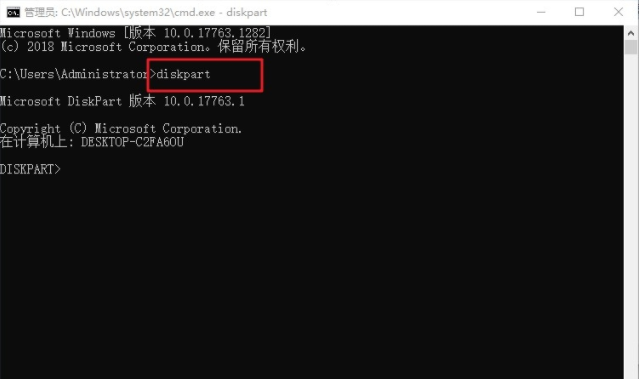 2、 在界面中輸入“diskpart”命令并回車確定。