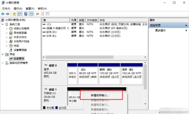 8、直接鼠標(biāo)右鍵單擊未分配的磁盤空間,選擇新建簡單卷。