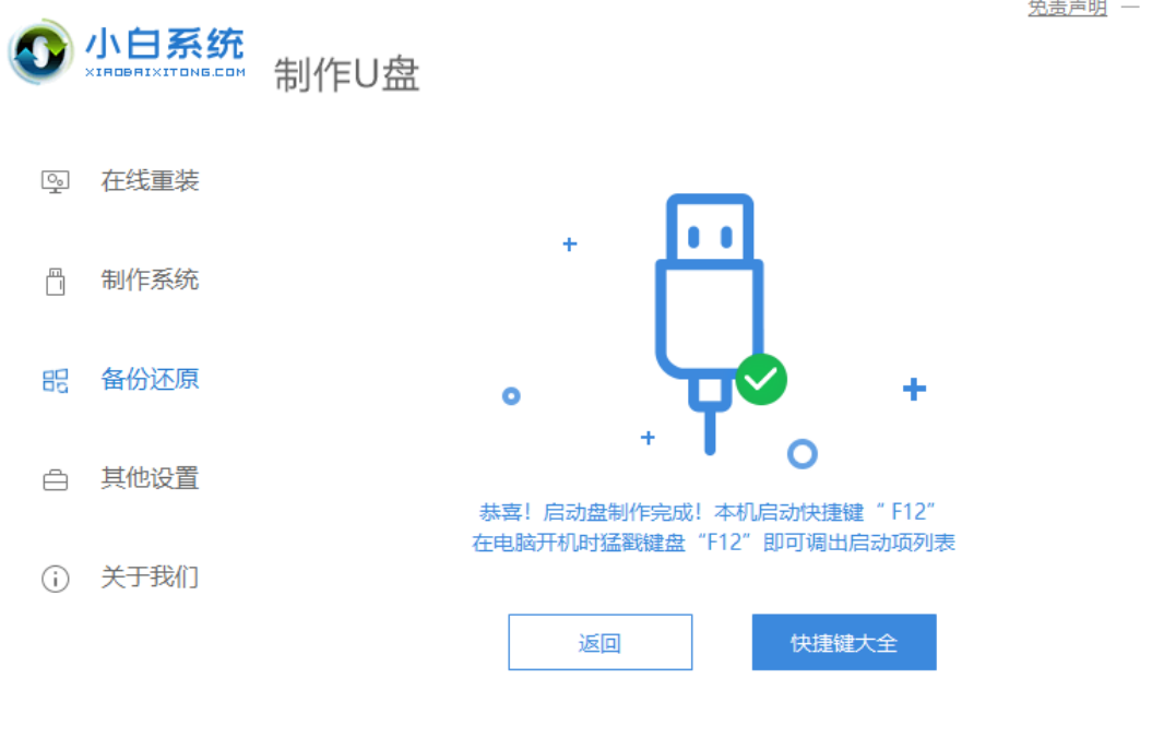 6.當(dāng)制作完成后,我們點(diǎn)擊返回,然后關(guān)閉軟件,這樣我們的u盤啟動(dòng)盤就制作完成啦。