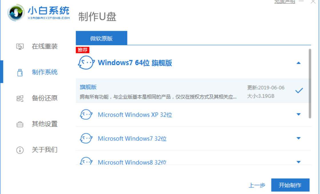 3.在頁面中,選擇我們需要下載的系統(tǒng),選擇好之后點(diǎn)擊“開始制作”。