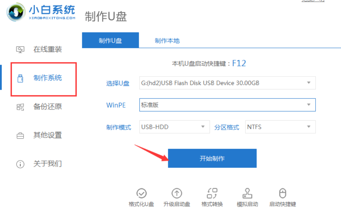 2.接著我們將準(zhǔn)備好的4G內(nèi)存以上的空白u(yù)盤插到電腦中,然后打開軟件,點(diǎn)擊左側(cè)的“制作系統(tǒng)”選擇下方的“開始制作”按鈕。