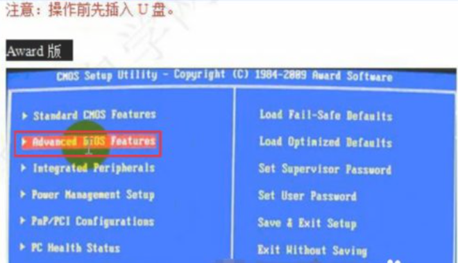2、在BIOS SETUP設置程序里找到高級BIOS特性設置Advanced BIOS Features。(以Award BIOS為例,絕大部分的主流版本,其它版本的與此類似)。