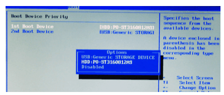 4、 我們可以看到 “1st boot device”,意思是第一啟動設(shè)備,選中第一啟動設(shè)備按回車鍵,在彈出的options窗口里,將U盤(帶有USB字樣)設(shè)置為第一選項。最后按f10鍵保存設(shè)置并退出,筆記本接下來重啟進入u盤啟動盤。
