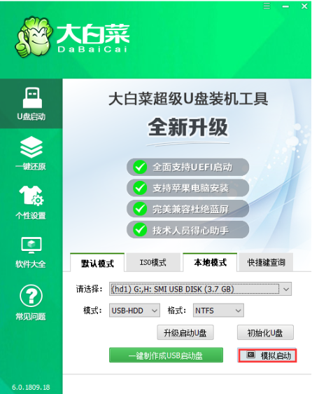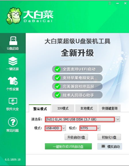 一、打開大白菜U盤軟件并插入U盤。要注意的是:本軟件涉及對可移動磁盤的讀寫操作,部分殺毒軟件和安全類軟件會導(dǎo)致制作失敗,運行程序前請關(guān)閉相關(guān)軟件! 選擇“默認(rèn)模式”,在磁盤列表中選擇需要制作啟動的設(shè)備,在模式選項中選擇“USB-HDD”,格式選擇“NTFS”。