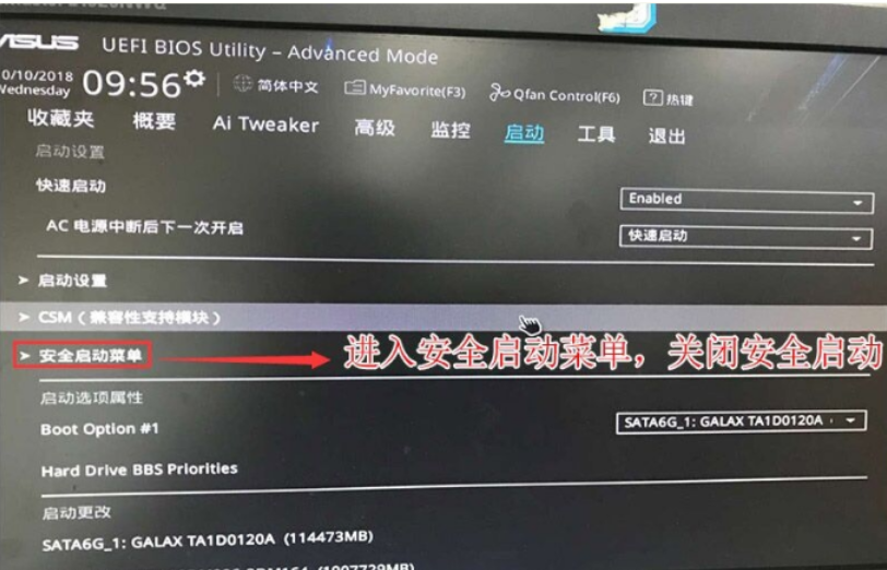 2、進入高級模式后,按→方向鍵移動到"啟動"選項,選擇安全啟動菜單,然后回車進入密鑰管理清除密鑰關(guān)閉安全啟動。