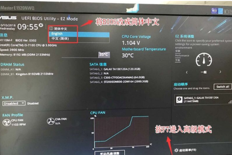1、重啟華碩電腦按esc或f8進入BIOS設(shè)置,將bios改成簡體中文,然后按F7進入高級模式,如下圖所示。