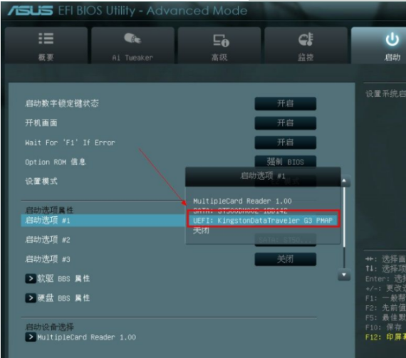 4、點(diǎn)擊回車“啟動選項(xiàng)#1”的選擇菜單,選擇U盤作為第一啟動項(xiàng)。