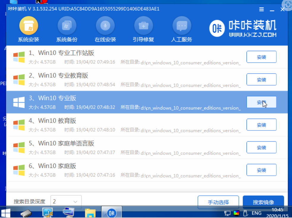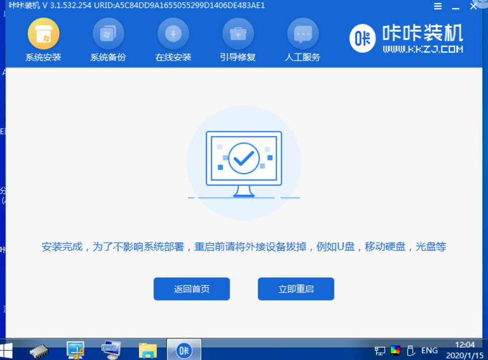 5、在pe系統(tǒng)桌面上打開咔咔裝機(jī)工具,選擇系統(tǒng)點(diǎn)擊安裝。