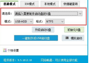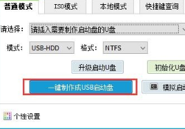 2、選擇普通模式選項(xiàng)卡,“請(qǐng)選擇”中選擇自身U盤設(shè)備名稱。模式選擇USB—HDD,格式選擇“NTFS”。