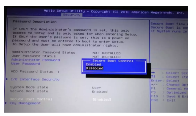 2、用方向鍵與回車鍵操作,把Secure Boot改為Disabled。