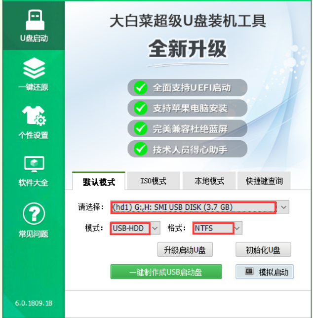 軟件版本:大白菜U盤啟動(dòng)盤制作工具