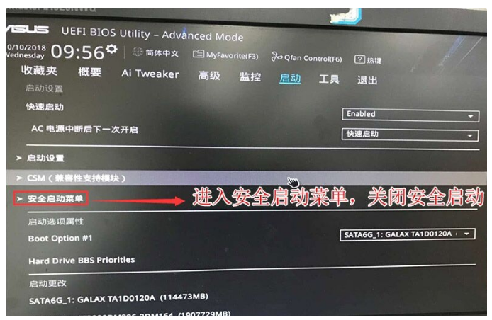 2、進(jìn)入高級(jí)模式后,按鍵盤(pán)方向方向鍵移動(dòng)到"啟動(dòng)"選項(xiàng),選擇安全啟動(dòng)菜單,然后回車(chē)進(jìn)入密鑰管理清除密鑰關(guān)閉安全啟動(dòng)。