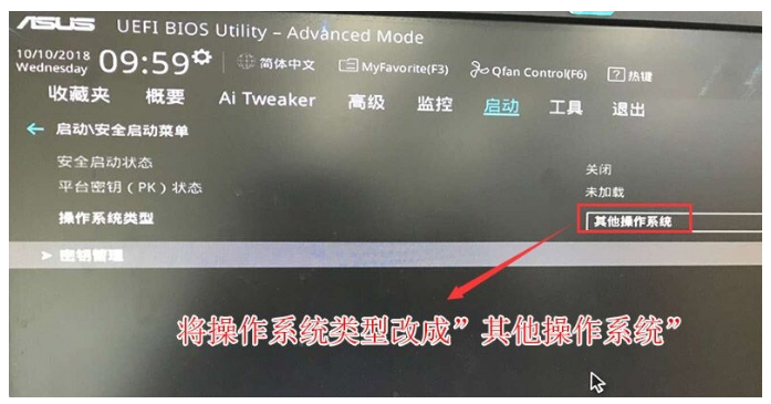 3、返回到"安全啟動(dòng)菜單"的選項(xiàng),將操作系統(tǒng)類(lèi)型改成"其它操作系統(tǒng)"。