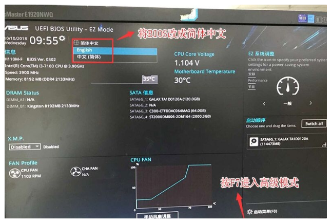 1、重啟華碩電腦,出現(xiàn)開(kāi)機(jī)頁(yè)面時(shí)按esc或f8進(jìn)入BIOS設(shè)置,然后將bios改成簡(jiǎn)體中文,按F7進(jìn)入高級(jí)模式。