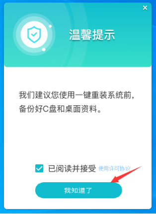 1、雙擊打開安裝好的“石大師一鍵重裝”,勾選后,點擊“我知道了”,插入U盤到電腦接口。