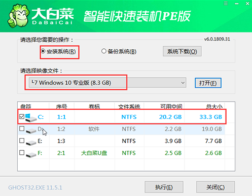 3、鼠標(biāo)雙擊打開裝機軟件,選擇win10映像文件,勾選“C盤”,點擊執(zhí)行即可。