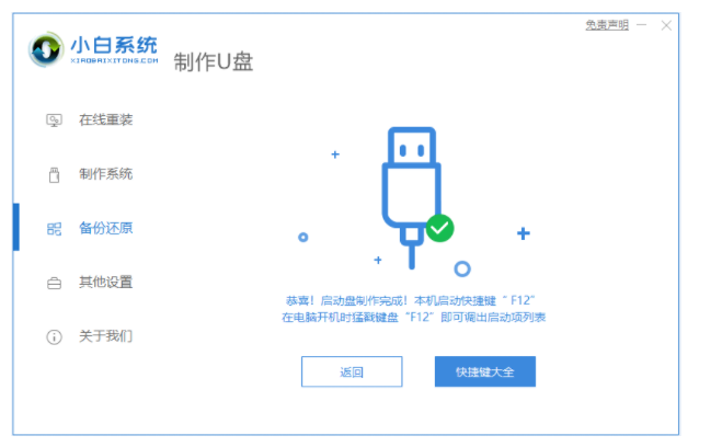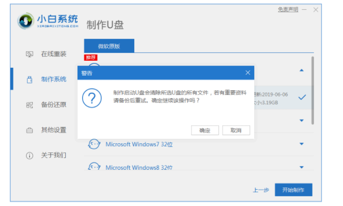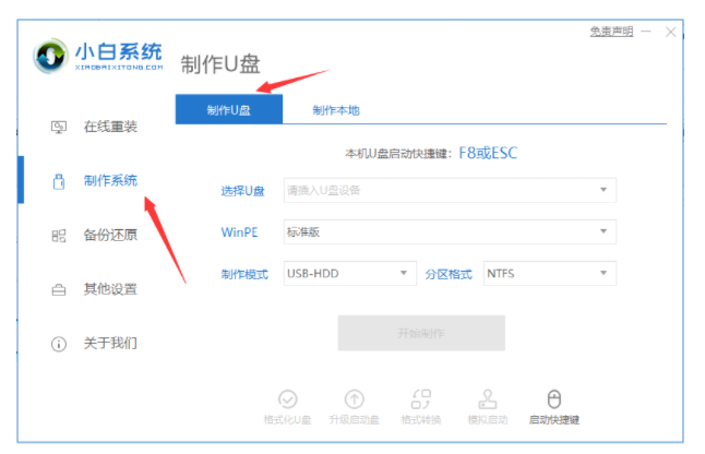 1、下載并運(yùn)行小白一鍵重裝系統(tǒng)軟件,插入U(xiǎn)盤(pán),選擇制作系統(tǒng)里的制作U盤(pán)選項(xiàng)。