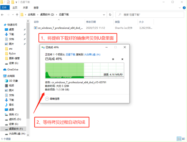 4、下載完成后,找到下載好的WIN7 ISO/GHO鏡像拷貝到U盤目錄,由于ISO/GHO文件通常都比較大,耐心等待幾分鐘。