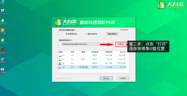 7、雙擊打開“大白菜一鍵裝機(jī)”,點(diǎn)擊“打開”選存放鏡像U盤位置。