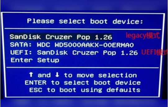 5、查詢要安裝的電腦機(jī)型的U盤啟動(dòng)快捷鍵,重啟出現(xiàn)開機(jī)畫面后按下此鍵,進(jìn)入優(yōu)先啟動(dòng)項(xiàng)設(shè)置界面,通過“↑↓”鍵選擇U盤選項(xiàng)后回車進(jìn)入大白菜winpe界面,選擇帶有USB字樣的或者選擇自己的U盤名稱標(biāo)識(shí)(小編的u盤名稱就是Sandisk Cruzer pcp1.26)