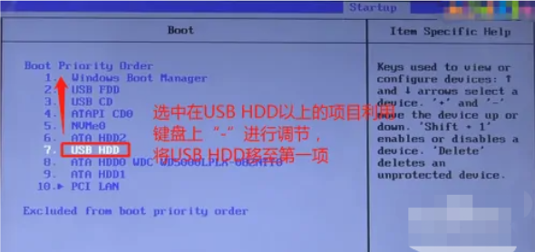 5、選中第七行“USB HDD”項(xiàng)以上的選項(xiàng),利用鍵盤上的“-”鍵將“USB HDD”設(shè)置成第一行。