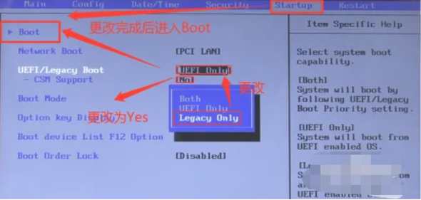 4、使用方向鍵切換到“Starup”界面,如圖所示的步驟操作,將“No”改為“yes”后選中Boot項(xiàng)進(jìn)入新界面。