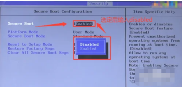 3、跳轉(zhuǎn)至SecureBoot界面后,選定后置代碼,輸入“Disabled”的代碼,然后返回“Security”界面。