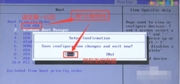 6、然后按F10鍵保存設(shè)置,最后選擇“Yes”重新啟動(dòng)電腦即可。