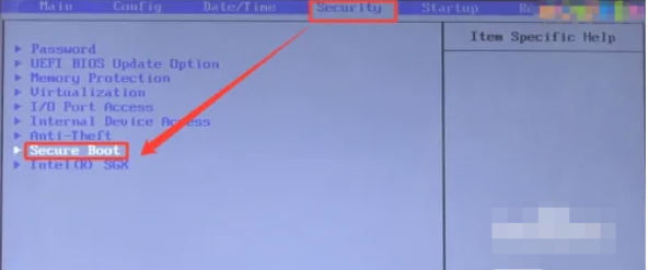 2、跳轉(zhuǎn)至BIOS界面后,使用方向鍵切換到“Security”界面,在該界面中選擇SecureBoot項(xiàng),回車進(jìn)入該頁(yè)面中。