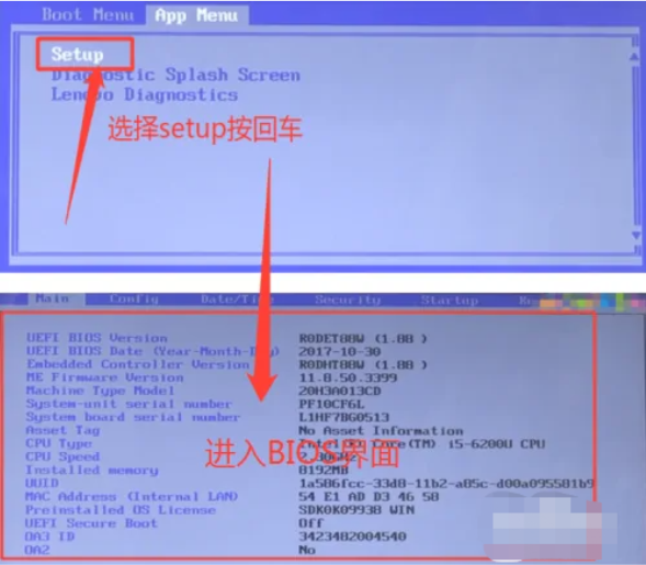 1、重啟電腦,出現(xiàn)開機(jī)啟動(dòng)頁(yè)面時(shí)按下啟動(dòng)快捷鍵,顯示如下頁(yè)面時(shí),按住Tab鍵切換到App Menu頁(yè)面,再選中Setup即可進(jìn)入BIOS界面。