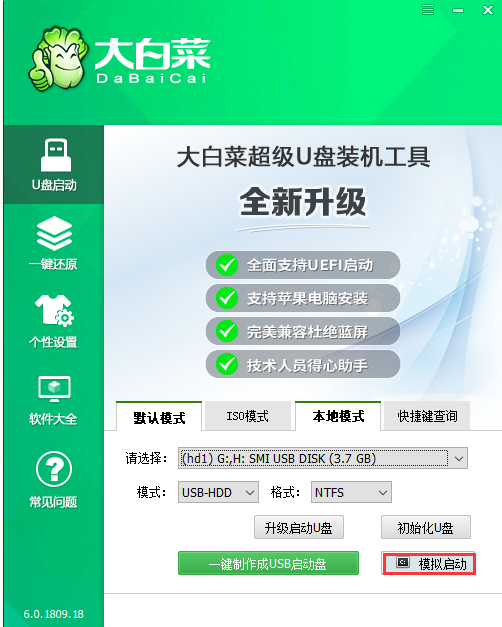 1、 下載安裝大白菜裝機(jī)版并打開(kāi),插入U(xiǎn)盤。 選擇“默認(rèn)模式”,在磁盤列表中選擇我們需要制作啟動(dòng)的設(shè)備,在模式選項(xiàng)中選擇“USB-HDD”,格式選擇“NTFS”。