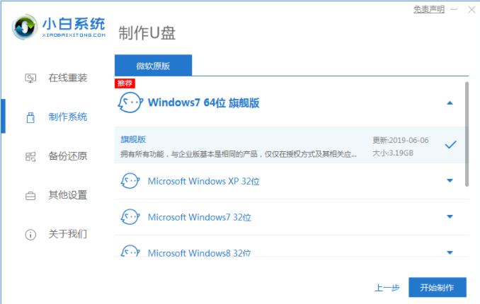 1、打開小白一鍵重裝系統(tǒng)軟件,選擇制作系統(tǒng)里的制作U盤。
