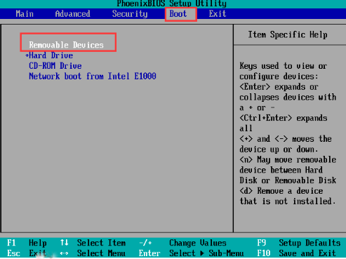 2.進(jìn)入BIOS設(shè)置界面之后,通過右方向鍵移動到“Boot”,再使用上下方向鍵將光標(biāo)移動到U盤的選項“Removable Devices”上,而有的電腦通常是以USB開頭。