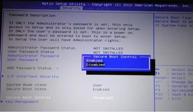 2、進入后通過方向鍵與回車鍵操作,在Boot菜單界面下或其他菜單比如Security,把Secure Boot改為Disabled(表示禁用安全引導(dǎo))與電腦啟動熱鍵不一樣。