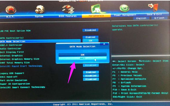 1、u盤分區(qū)的方法,首先插入U(xiǎn)盤,進(jìn)BIOS界面開(kāi)啟硬盤AHCI模式