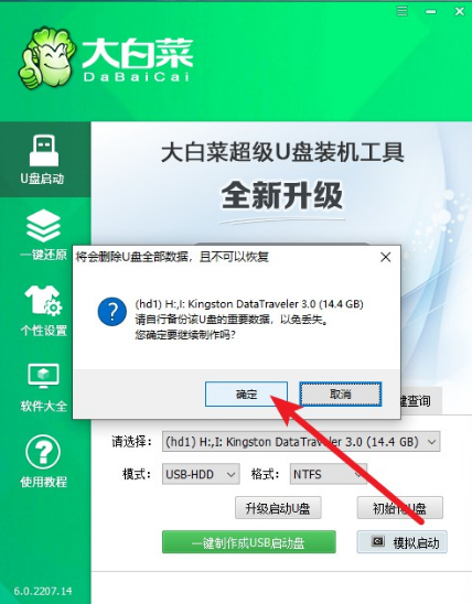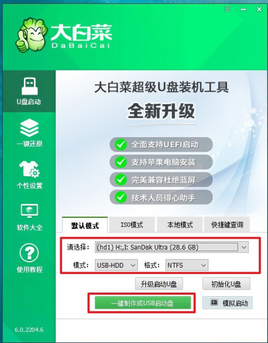 1.首先我們需要下載一個(gè)大白菜工具,然后把一個(gè)8g的可用內(nèi)存的U盤插入電腦,u盤的模式和格式,如果沒(méi)有特殊要求,可以默認(rèn)選擇USB—HDD以及NTFS,點(diǎn)擊一鍵制作u盤啟動(dòng)盤。