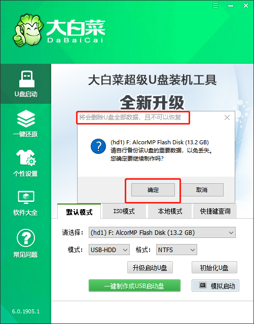 3、在彈出的信息提示窗口中,點(diǎn)擊“確定”(注:制作啟動(dòng)盤(pán)會(huì)格式化U盤(pán),請(qǐng)?zhí)崆皞浞莺肬盤(pán)數(shù)據(jù)!)
