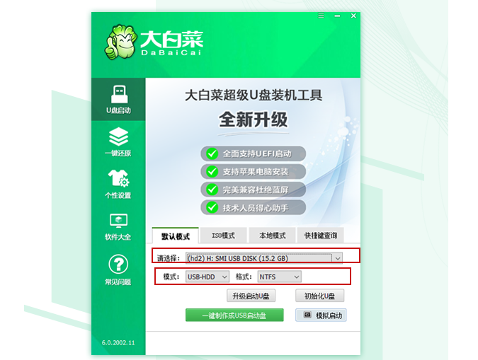 1、下載并安裝大白菜超級(jí)u盤(pán)裝機(jī)工具,并將U盤(pán)插入電腦,選擇“默認(rèn)模式”,點(diǎn)擊需要制作啟動(dòng)的設(shè)備,在模式選項(xiàng)中選擇“USB-HDD”,格式選擇“NTFS”