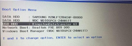 6、最后我們插入啟動盤到電腦接口上,重啟電腦時快速按F12或FN+F12調(diào)出啟動管理窗口界面,選擇USB HDD按回車鍵進入PE系統(tǒng)即可使用u盤重裝系統(tǒng)。