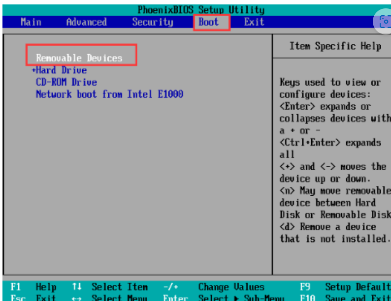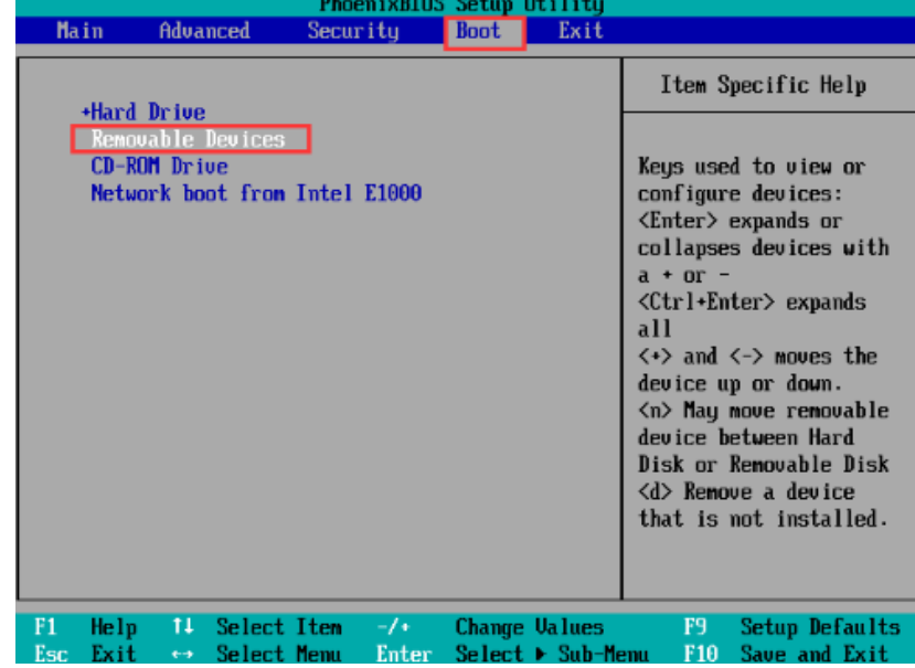 2.進入BIOS設置后,我們使用右方向鍵移動到“Boot”,接著使用上下方向鍵將光標移動到U盤的選項“Removable Devices”上。