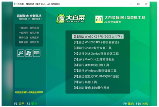 6、制作完成后,選擇模擬啟動(dòng)測(cè)試,若能夠進(jìn)入大白菜winpe主菜單,即完成。