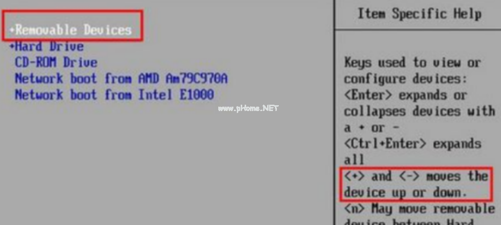 方法一:進(jìn)入到BIOS界面將“removeble device”移動(dòng)至最上面設(shè)置