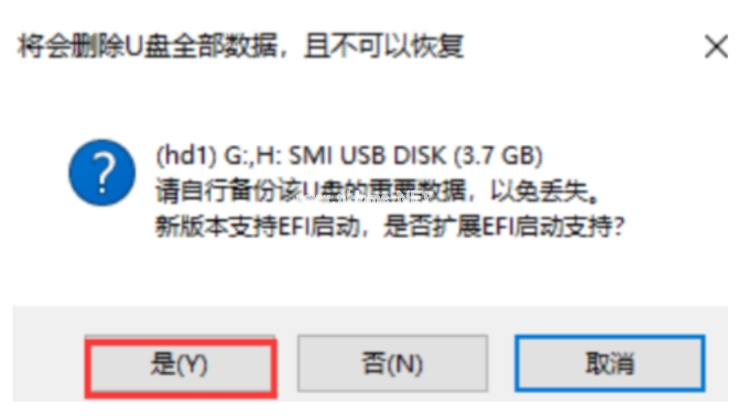 4.點擊一鍵制作,【U盤數(shù)據(jù)刪除且不可恢復】的窗口界面,選擇【是】。