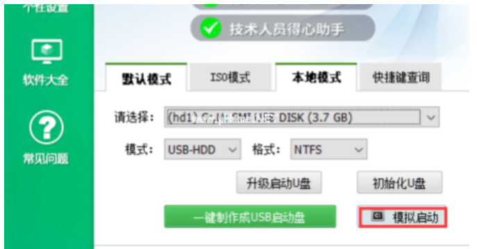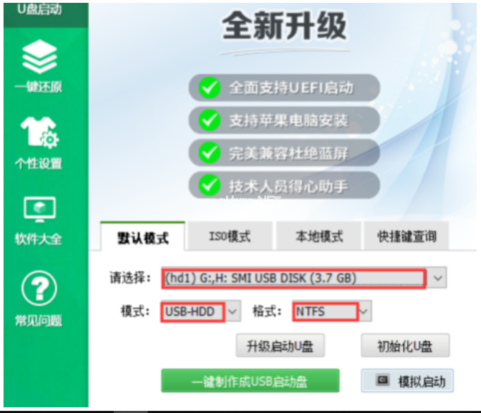 1.打開超級U盤機,勾選“U盤啟動”模塊,點擊【默認模式】。