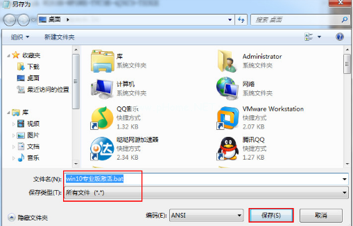 2、完成后,我們點擊“另存為”,并在彈跳出的頁面中,把保證的位置選擇在桌面,保證的類型改為所有文件文件名改為.bat格式的文件,點擊“保存”。