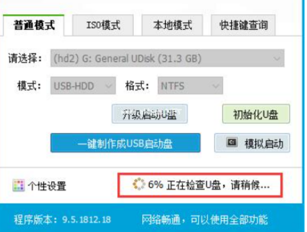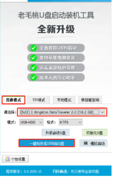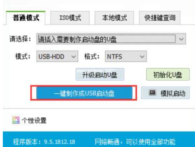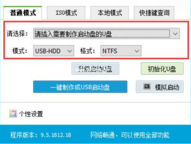 3、選擇普通模式選項卡,這里“請選擇”中選擇自身U盤設(shè)備名稱(通常會自動識別)。模式選擇USB—HDD,格式選擇“NTFS”。
