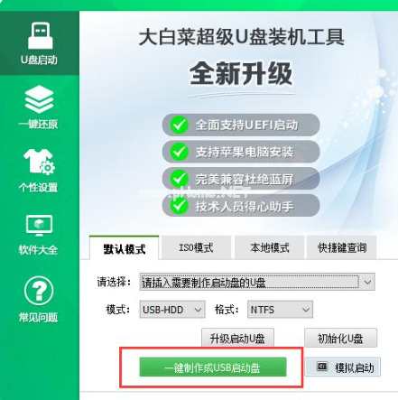1、需要準(zhǔn)備一個(gè)8G及以上的U盤,點(diǎn)擊打開大白菜制作工具,插入U(xiǎn)盤到電腦上,默認(rèn)格式為NTFS系統(tǒng),選擇一鍵制作u盤啟動(dòng)盤。