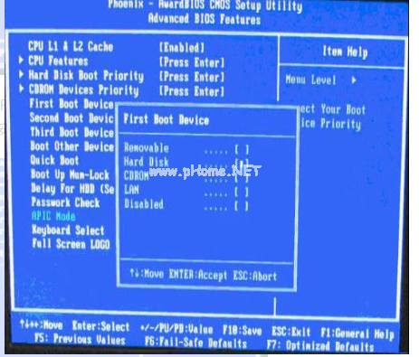 4、再選擇第一啟動設(shè)備(First Boot Device):該版本的BIOS這里沒有U盤的“USB-HDD”、“USB-ZIP”之類的選項,經(jīng)嘗試選擇移動設(shè)備“Removable”不能啟動,但選擇“Hard Disk”可以啟動電腦。