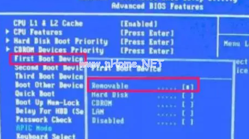 4.返回AdvancedBIOSFeatures窗口后,選擇FirstBootDevice,即第一個(gè)啟動(dòng)盤,回車,進(jìn)入小窗口后,選擇Removable或USB-HDD,都是U盤,選擇后回車,最后按F10保存退出就設(shè)置完成啦。