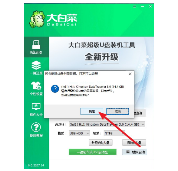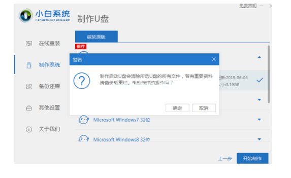 2.確認(rèn)我們的操作,因?yàn)槲覀冎谱飨到y(tǒng)會(huì)把之前U盤里面的數(shù)據(jù)格式化,確定沒有重要的數(shù)據(jù)后,點(diǎn)擊確定進(jìn)入下一步。